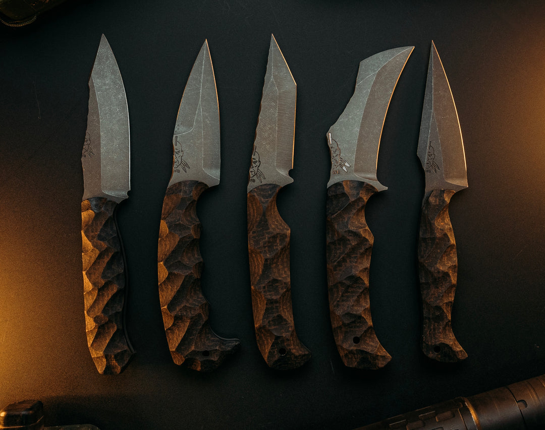 Chef Set- Desert Ironwood, Dyed Redwood, Spalted Tamarind, Buckeye Burl, Copper and Black G10 Liner, Mosaic Pins, Copper Lanyard Pin, Smooth Grip