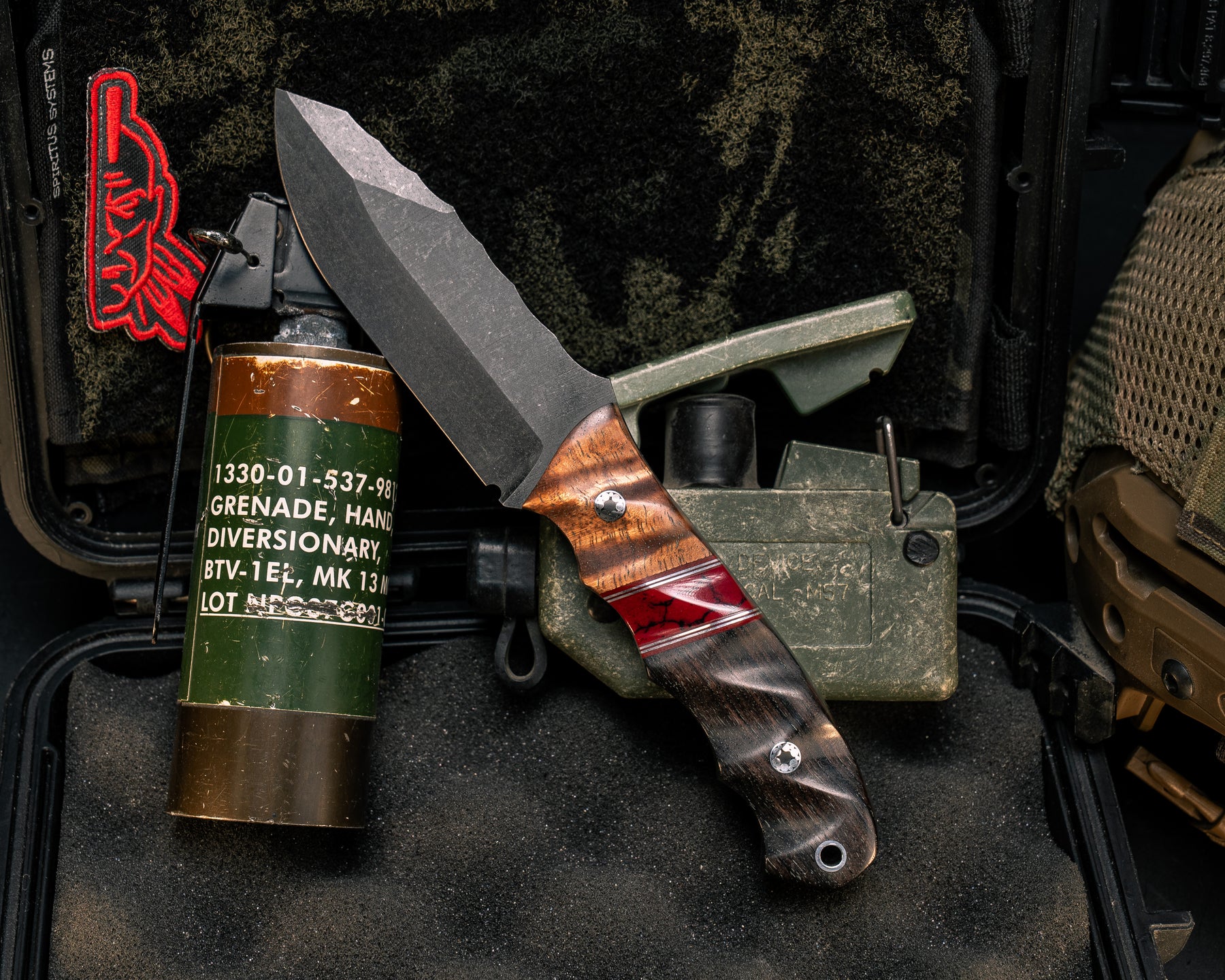 Disaster Jr- Hawaiian Curly Koa, Cherry G10 and Aluminum Pin Striping, Bloody Basin Tru-stone Split, Gaboon Ebony, Mosaic Pins, Aluminum Lanyard Pin, Textured Grip