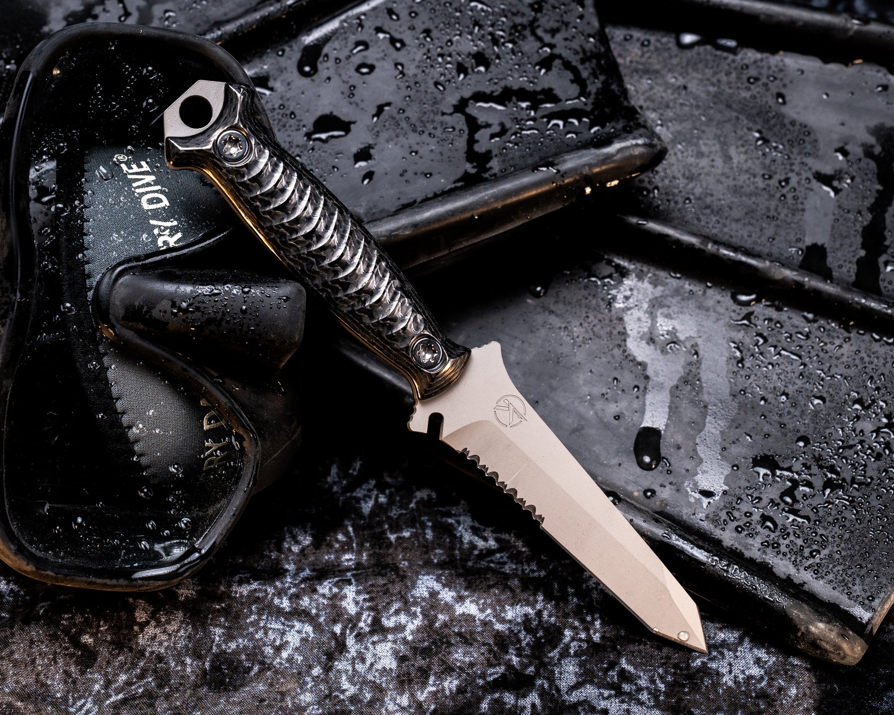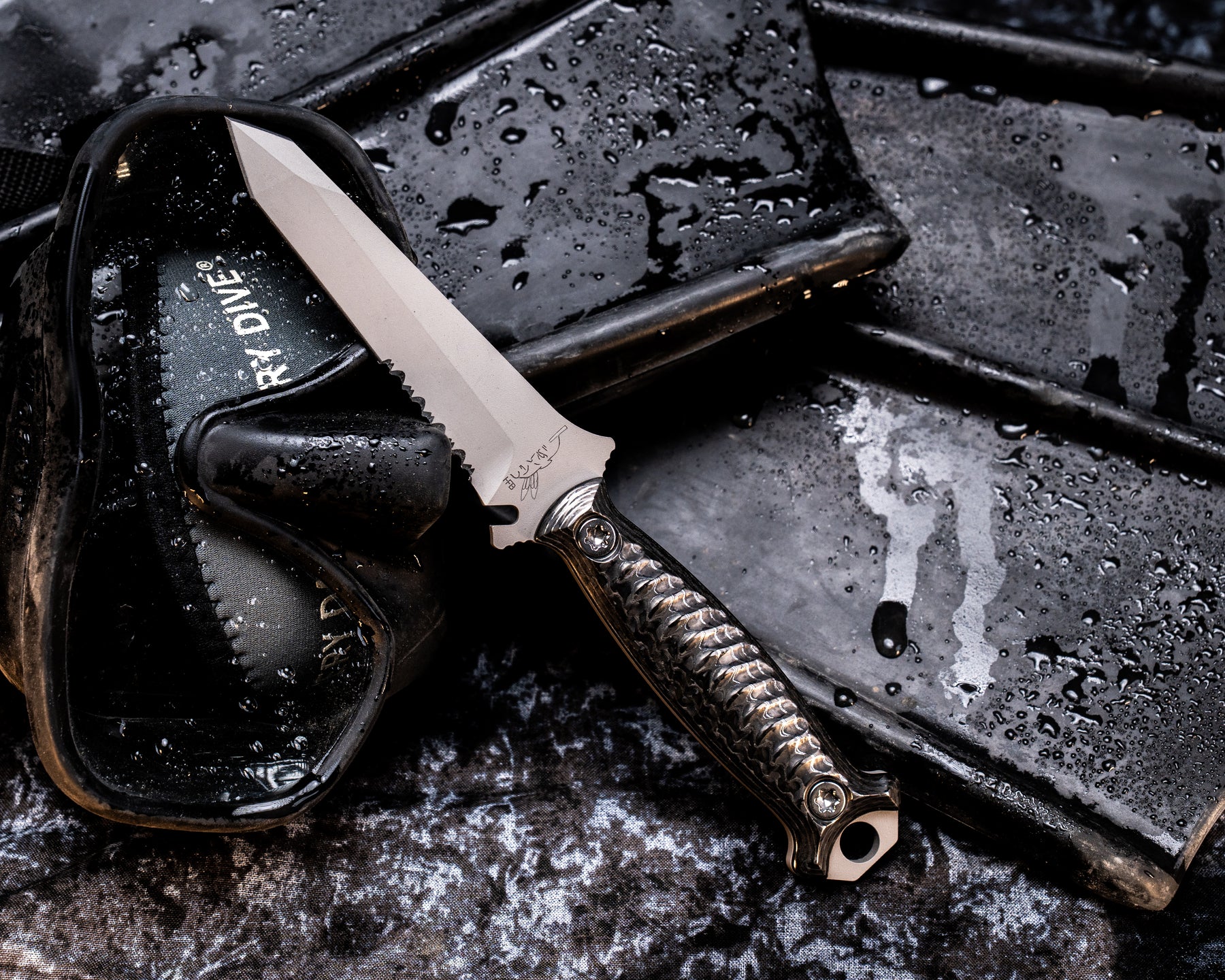 Dive Knife Tanto- Stainless Steel Dragon Strike Carbon, Steel Grey Cerakote, Ti Torx Bolts, Textured Grip