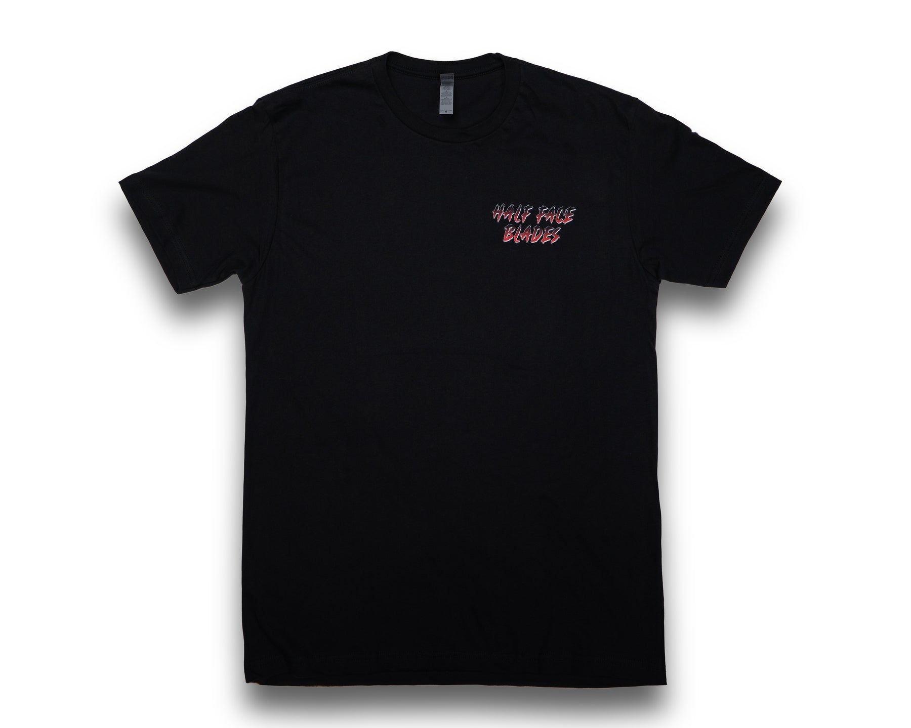 Half Face Blades Logo on Front, Chucky holding Santoku Blade Graphic On Back