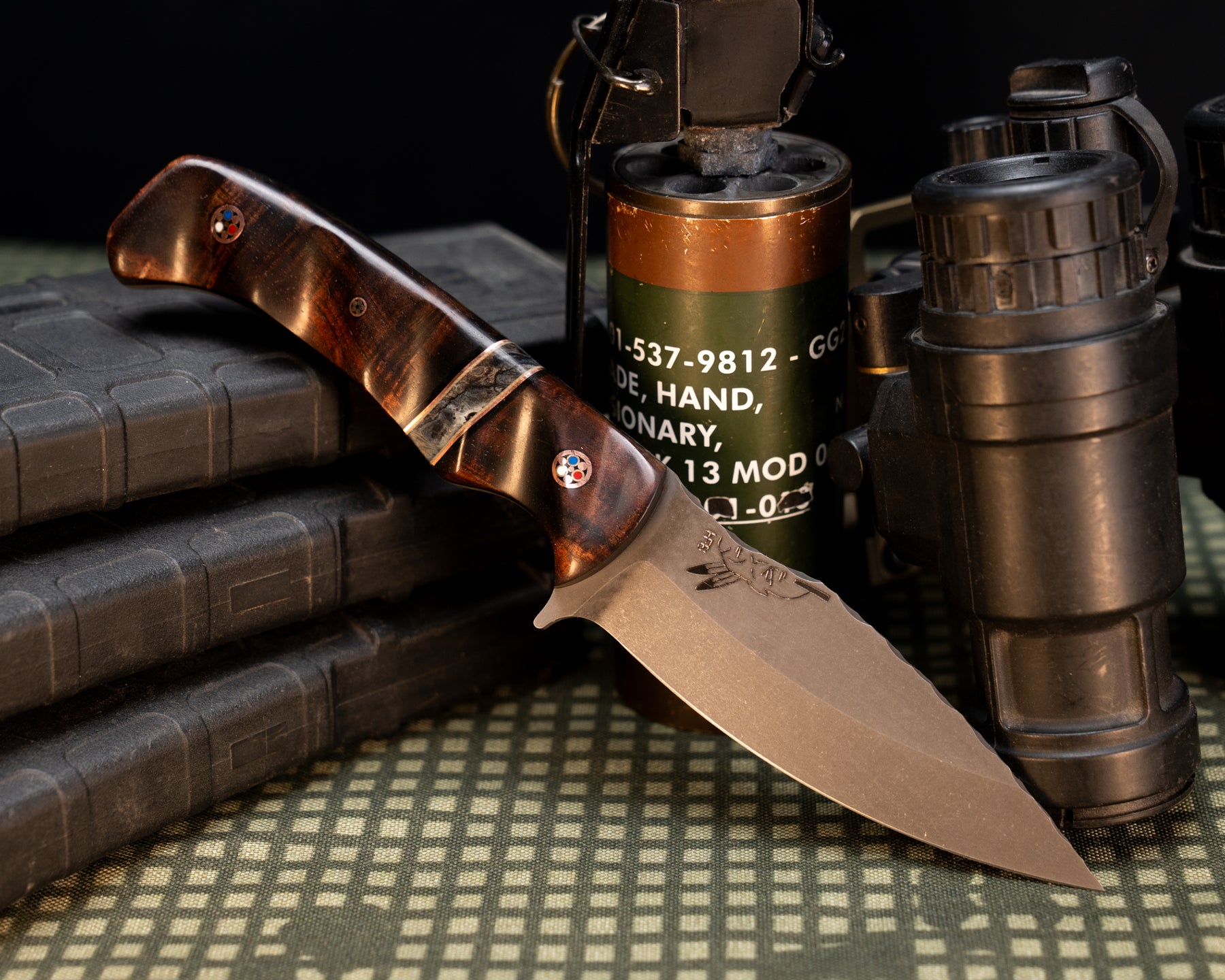 Ishi- Hawaiian Curly Koa, Black G10 and Copper Pin Striping, Dyed Maple Split, Spine Work and Resin, Patriot Mosaic Pins, 1/8" Mosaic Pin, Grooved Grip