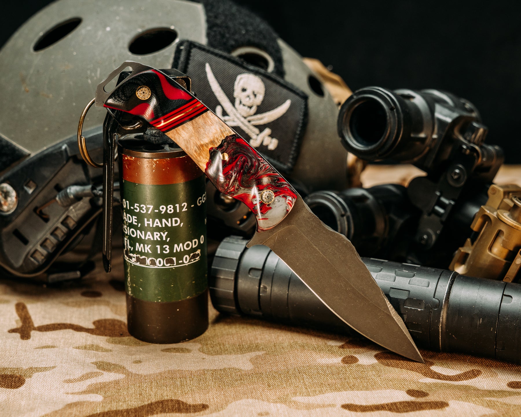 Modified Ishi- Red and Grey Swirl Resin and Burlwood, Black G10, Cherr