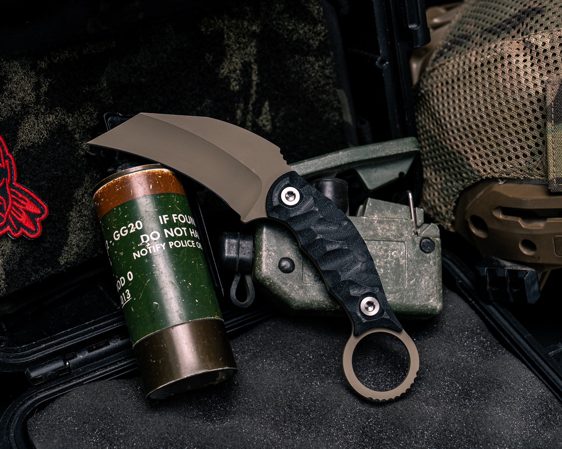 Karambito- Black G10, FDE Cerakote, Ti Allen Bolts, Textured Grip