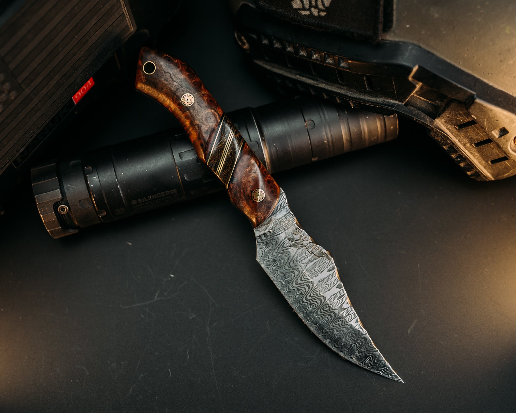 Red Cloud- Baker Forge Ladder Pattern Damascus- Redwood, Black G10 and Brass Pin Striping, Gold Dark Matter Carbon Split, Mosaic Pins, Brass Lanyard Pin, Grooved Grip