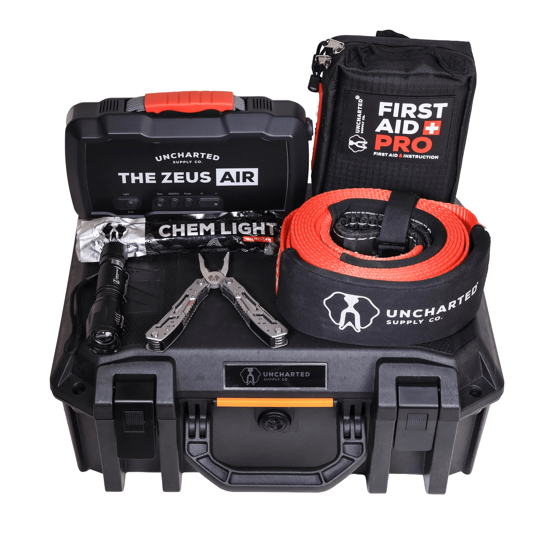 Zeus Air – Jump-start engines up to 6.0L diesel, inflate tires to 150 PSI, charge devices, light your path, or signal oncoming traffic — all from one compact, powerful unit.