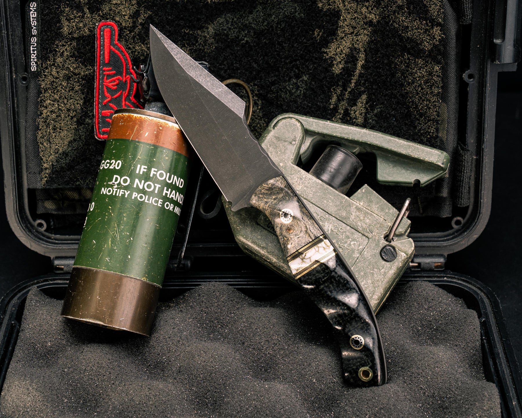 Widow Maker JR- Buckeye Burl, Black G10 and Brass Pin Striping, White with Gold Web Tru-stone Split, Black Burlap Micarta, Mosaic Pins, Brass Lanyard Pin, Textured Grip